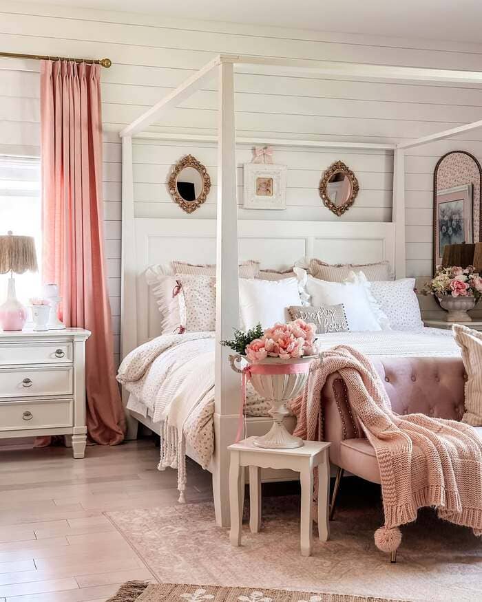 Four poster bed, pink drapes, sweet mirrors, and a tufted bench. It’s girly, yes, but the whites and woods keep it steady. When you stack this many soft things, vary the pattern scale. Big knit, small dot, solid. If all the textures are tiny, it goes fussy. I like to toss one pillow with embroidery for depth.
