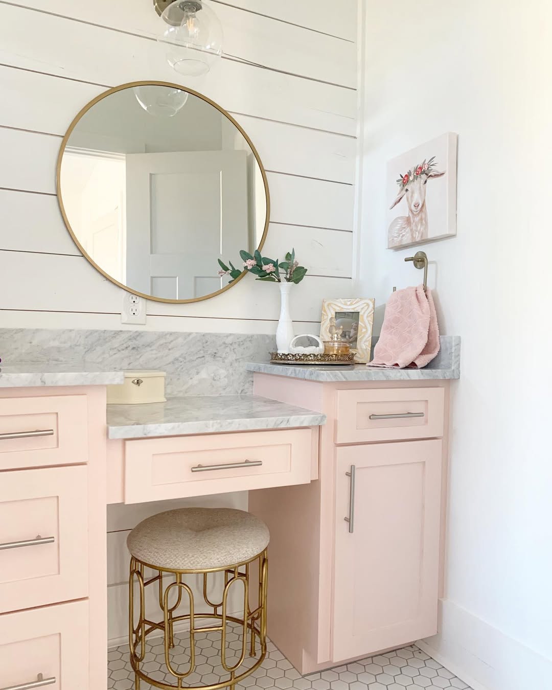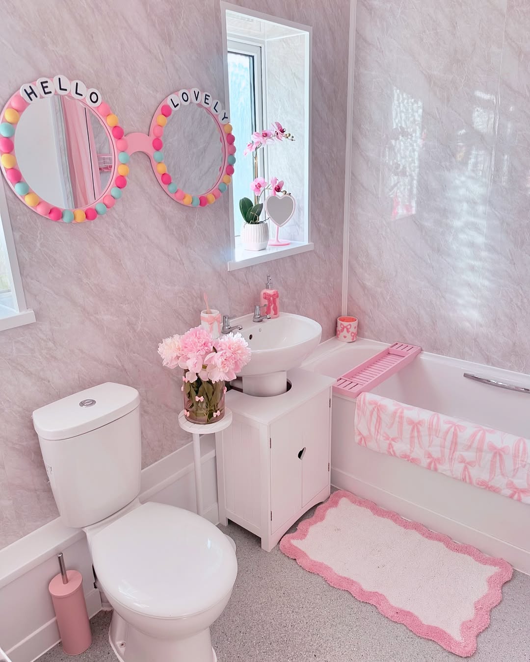 Last one is pure fun. The wall is marble look, and two round mirrors are connected with a pink frame like giant sunglasses. Each lens spells HELLO and LOVELY. There are orchids in a window niche, a pink scallop mat, and a super tidy sink. It’s sweet and silly, and honestly I love when bathrooms don’t take themselves too serious.