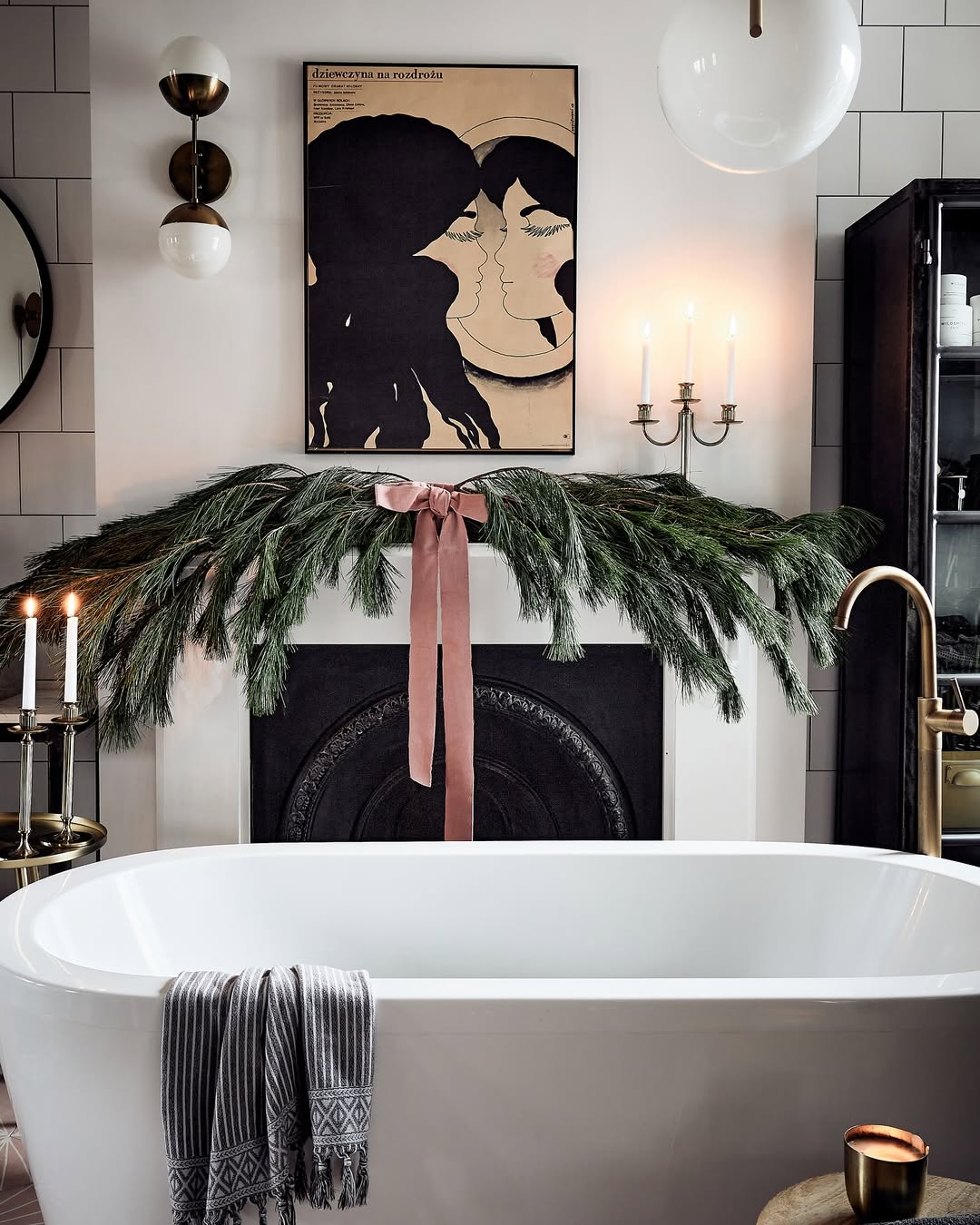 I gasped when I saw the moody fireplace wall behind the tub. It holds a long, low swag of draping pine tied with a dusty rose velvet ribbon. Brass candleholders, a modern print, and the white tub keep things chic. This isn’t covered in pink, but that one ribbon turns the vibe from winter to holiday fast. It proves pink holiday bathroom decor can live even in a mostly neutral space.