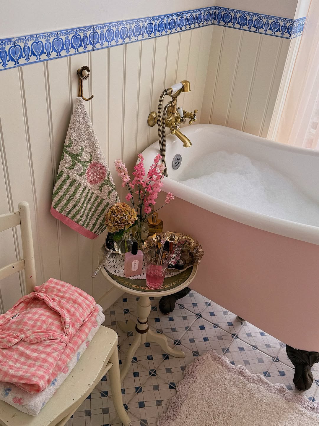 Vintage pink clawfoot tub with sweet blue border and tiny table