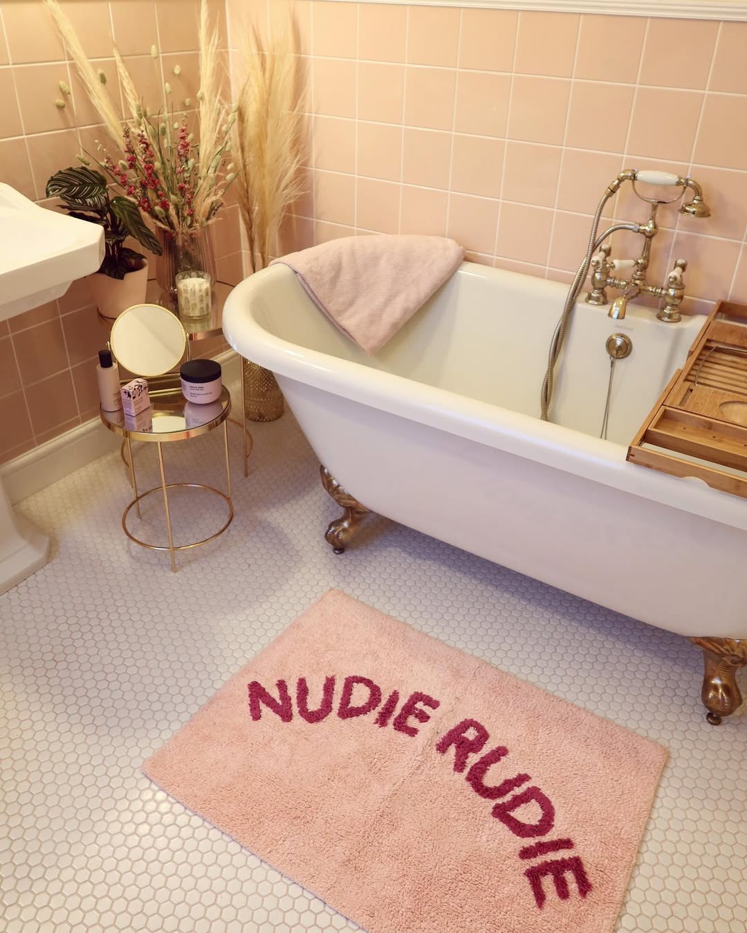 Here the pink wall tiles glow like a sunset. A white clawfoot tub sits beside a gold side table sprinkled with skincare, and tall vases of pampas grass bring texture. The star is a fluffy rug that says NUDIE RUDIE and it made me laugh out loud. This room is playful and a little glam. If you love pink bathroom Christmas decorations that still feel grown up, this mix is it.