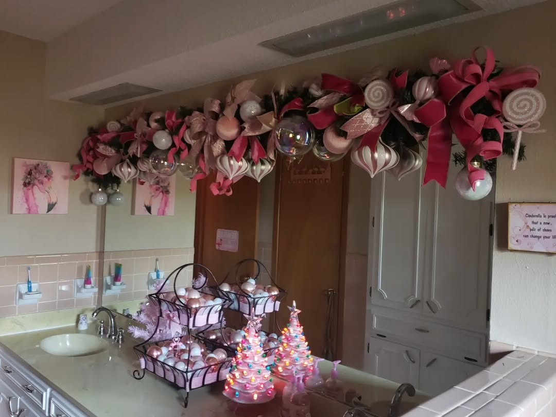 This one is extra in the happiest way. A giant garland runs across the entire mirror wall and drips with big pink bows, striped lollipop picks, frosted ornaments, and shimmery balls. On the counter there are tiered baskets full of baubles and two tiny cone trees that glow. It’s like walking into a sugar shop. This is bubblegum holiday bathroom decor and kids will squeal.