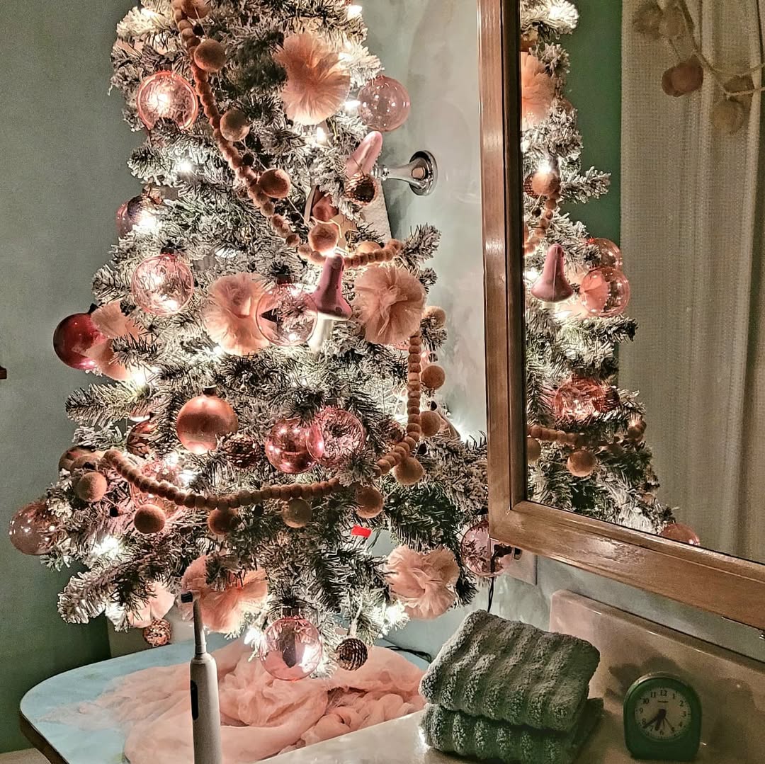 This photo made me grin because it’s bold in the simplest way. A flocked tabletop tree sits right on the vanity next to the mirror, wrapped in pink glass ornaments, pom garlands, and warm lights. The glow bounces off the glass so it looks twice as full. This is a pink Christmas vanity decor move that works even if you only have ten minutes.