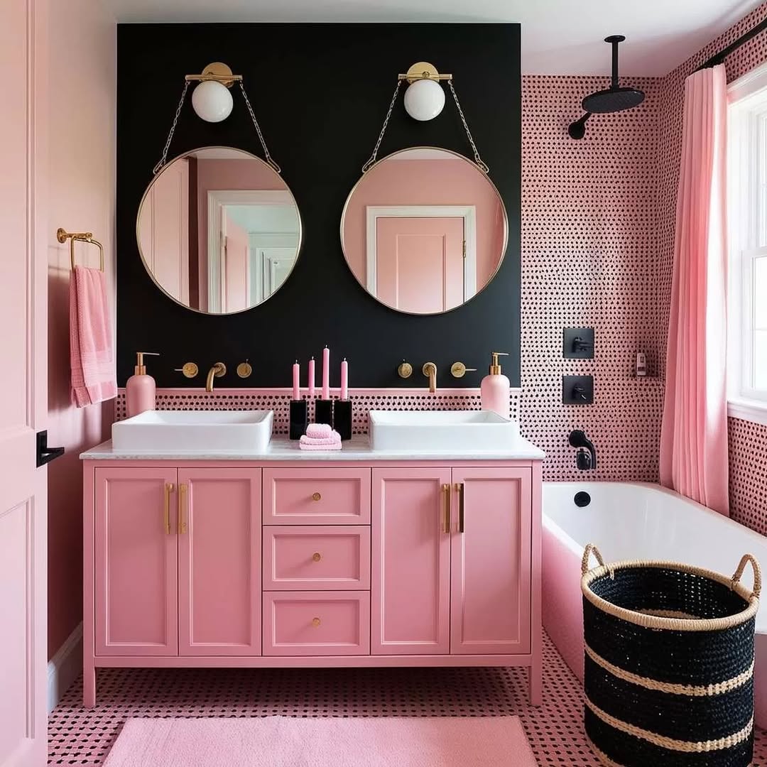 This space is bold and graphic. Pink vanity, twin round mirrors hanging on chains, a jet black wall, and soft pink candles lined up like soldiers. It’s modern but still sweet. The contrast makes the pink sing. For a modern pink bathroom Christmas theme, you don’t need garlands everywhere. Just repeat shapes and keep the palette tight.