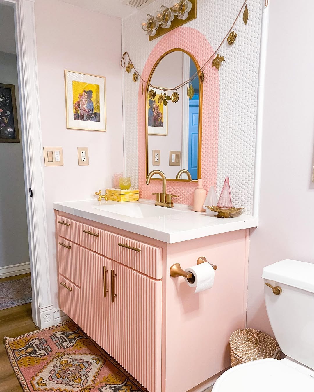 Pick one focal spot only. Either the mirror, the shelf, or the vanity. Add one or two pink pieces and a winter scent. Done.