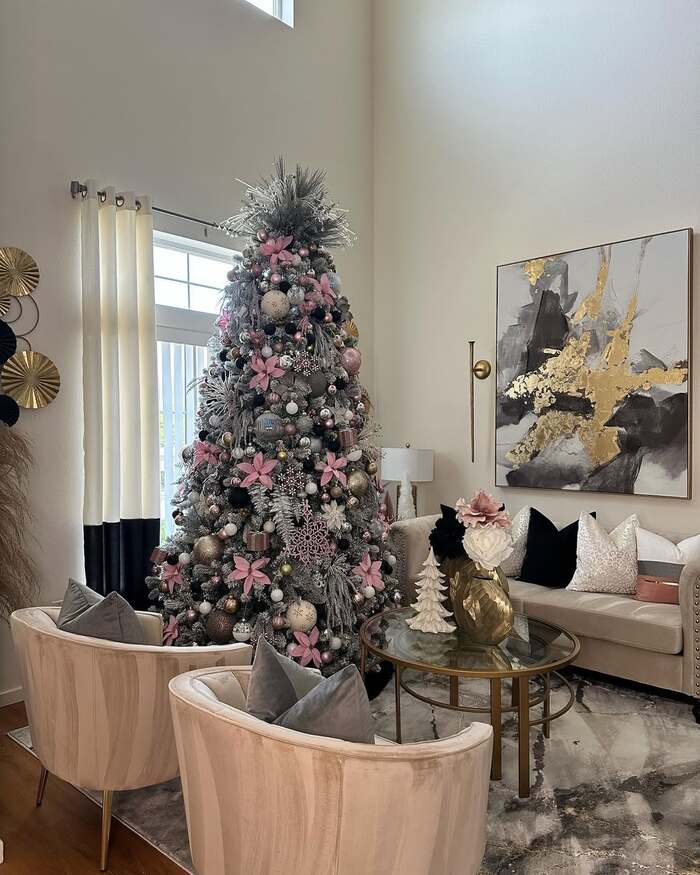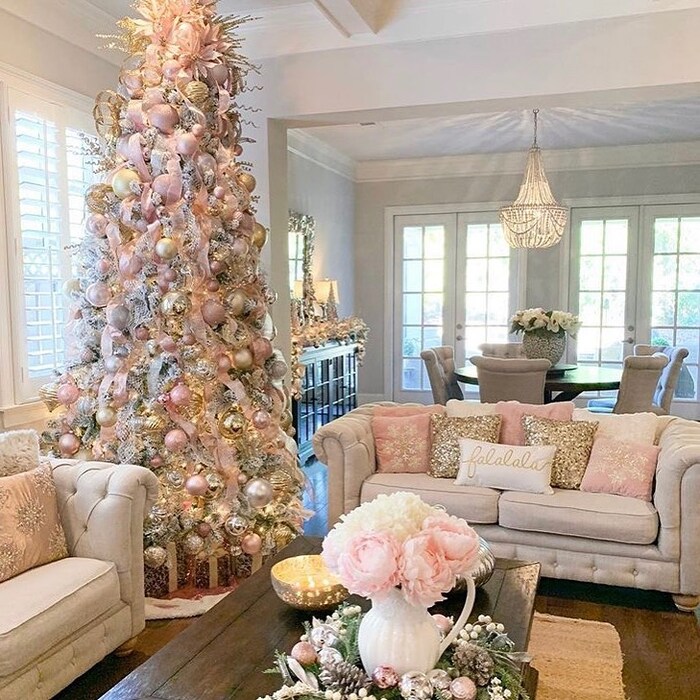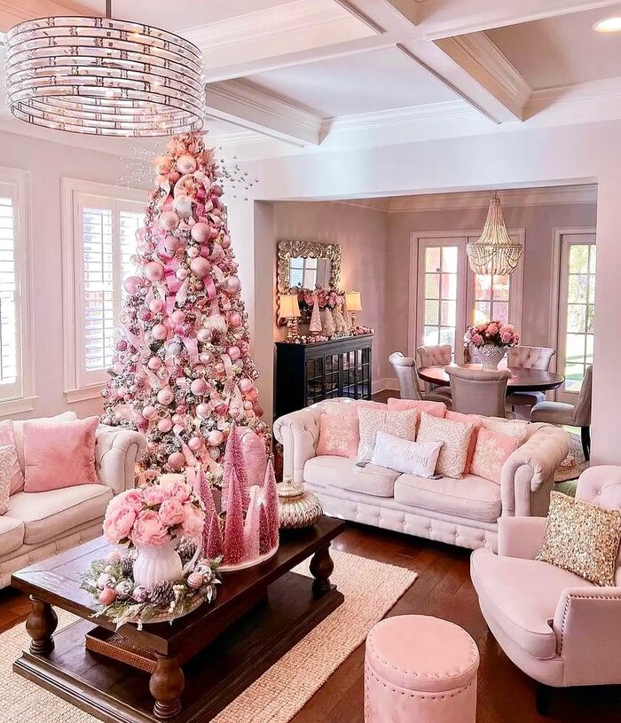 This space has those tufted sofas and a tall tree stuffed with blush ornaments, pearls, and glass balls. The ceiling fixture and chandelier sparkle, but the wood floor and coffered ceiling keep it grown up. I’m obsessed with how the pillows repeat soft pinks in different textures. The whole thing reads like a rosé party for your eyes.