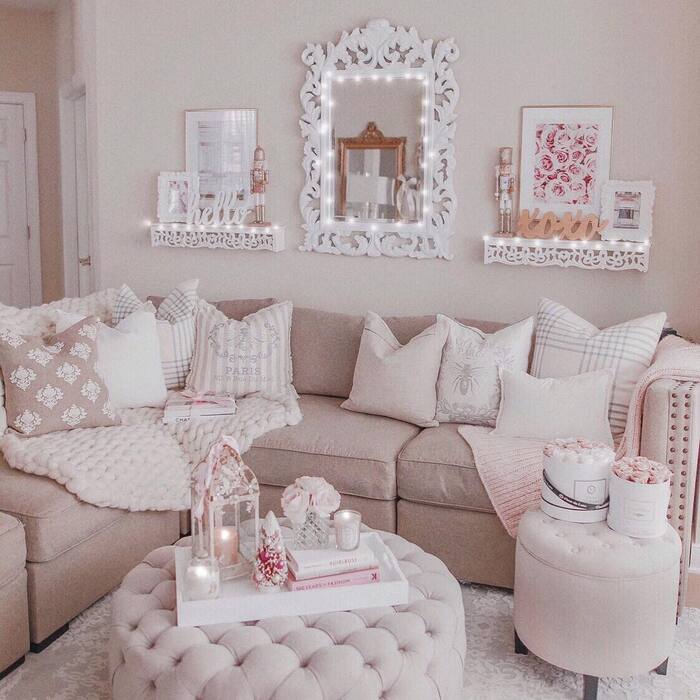 This last idea gives candlelit tea party vibes in the best way. A tufted ottoman holds a tray of books and lanterns, the sectional is stuffed with soft pillows, and fairy lights outline the ornate mirror shelves. Not every pink christmas living room needs a giant tree, honestly. This one whispers holiday with small details and I’m here for it.