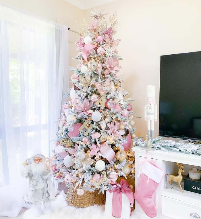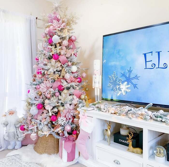 This tree sits by a bright window and a white media cabinet. The ornaments are soft, like meringue kisses. There’s a nutcracker, stockings, and a simple woven basket around the base instead of a skirt. It’s sweet without being sticky, the exact vibe for small rooms or rentals. If you’re building a gentle pink holiday living room, this palette behaves very well with sunlight.