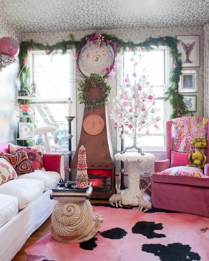 This idea is for my brave friends. We’ve got a white tinsel tree with hot pink baubles, a pink cowhide-style rug, eclectic art, and a carved mantel clock that feels like a character in a story. It’s chaotic in a good way. I swear I can hear jingle bells and a retro soundtrack. A very fun take on a pink festive living room that refuses to be quiet.