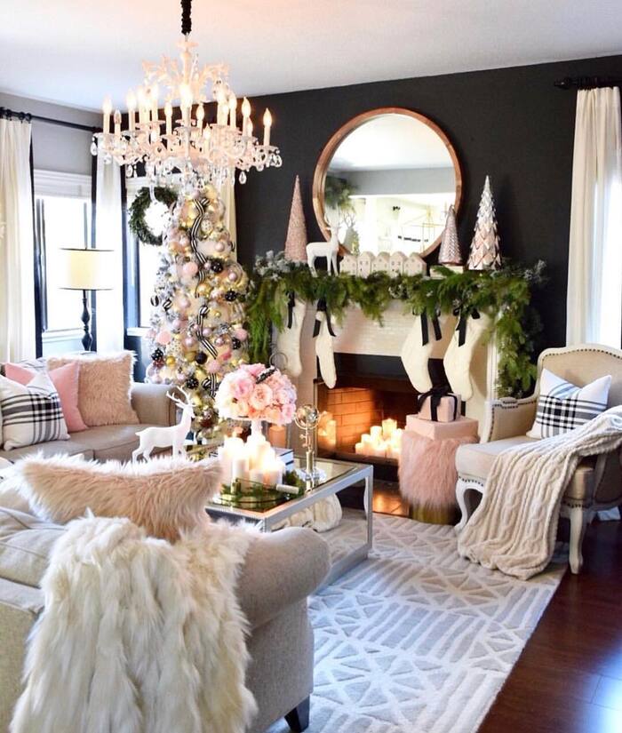 I love contrast more than I should, and this room nails it. Dark accent wall, bright windows, loads of cream textiles, and a tree wrapped with black and white ribbon plus pink ornaments. The mantel leans classic with green garland and stockings, but those touches of blush and plaid make it modern. This is a perfect choice if your partner fears a full pink christmas living room and wants something moodier.