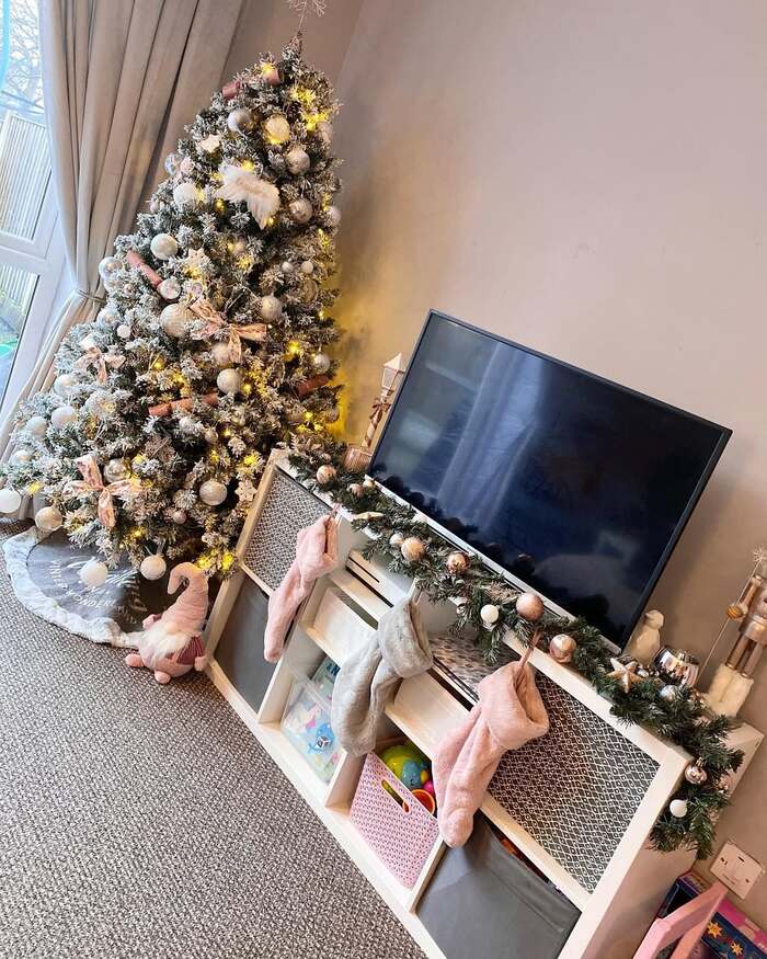 Do this quickly. Stick to three pink tones only, then repeat them everywhere so the room reads cohesive on screen. Swap your everyday art on the TV with a static snowy graphic and you get instant atmosphere for free. Small trick I stole from a stylist: stuff the stockings with tissue paper so they hang full. Looks luxe even when they’re empty. And store everything in a clear bin labeled “TV tree” so next year set-up is painless.