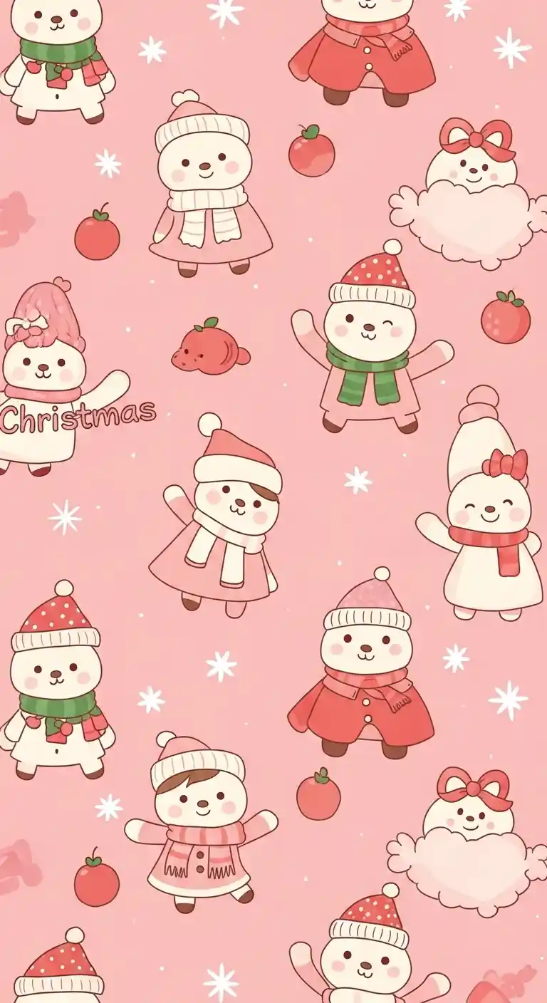 This seamless pattern piles on cheerful snow-people in little scarves and coats, tiny white snowflakes, red apples and strawberries, plus a fluffy cloud tied with a bow. There’s a hand-lettered “Christmas” doodle that gives it notebook-energy, the good kind. It’s bright without shouting, and the characters read clearly even on a lock screen.