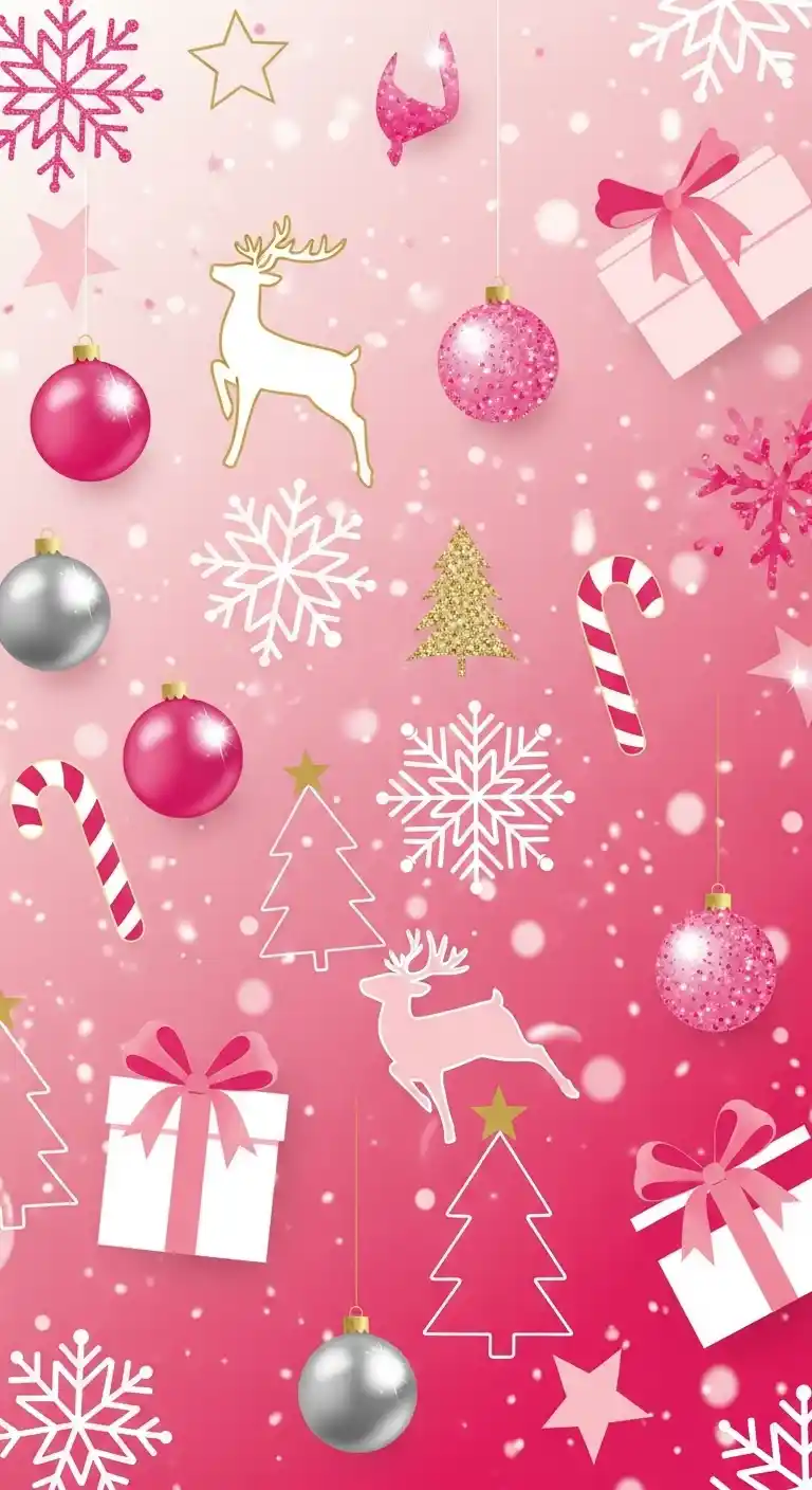 A rich pink gradient fades behind sparkly bokeh while hanging baubles in pink and silver float with gold and white reindeer silhouettes. Candy canes, starbursts, and gift boxes dot the scene. It’s glam and a bit extra, which honestly is exactly what some of us want for December.