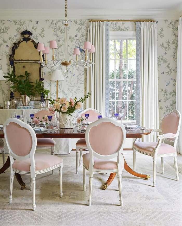 This kind of pink dining room decor is basically a cheat code. The pale blush chairs look sweet, but the white trim and light walls keep it from feeling like a kid’s room. I like how the shape of the chairs feels classic, like you could host a holiday dinner and nobody would question it.