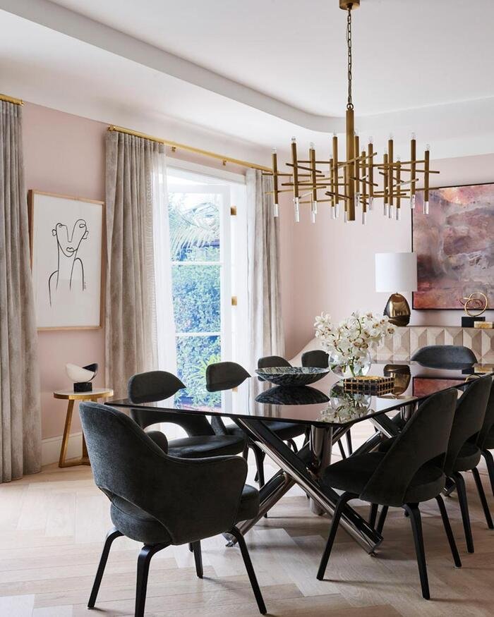 To pull this off, keep the pink consistent across the chairs. Then repeat gold once or twice somewhere else, maybe in the chandelier, mirror frame, or a tray. Add texture so the room doesn’t feel flat: velvet chairs, a woven runner, a ceramic vase.