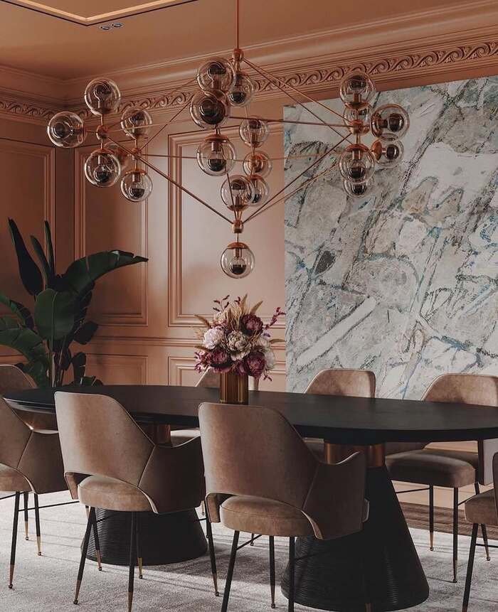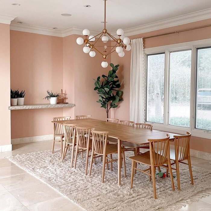 Ok this pink dining room decor is my “fancy restaurant energy” pick. The wall color is like dusty peach or clay pink, and it feels warm and serious. The table is dark and smooth, and those chairs are soft brownish pink, like latte meets rose. Then boom, that bubble light fixture floats overhead and makes the room feel designer, even if the rest is minimal.