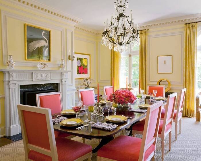This room is like… preppy but fun. The coral-pink chairs (or pink-red chairs) look amazing with traditional details like molding, a fireplace, and a fancy chandelier. It’s pink dining room decor that feels like a real dining room, not just a corner with a table.