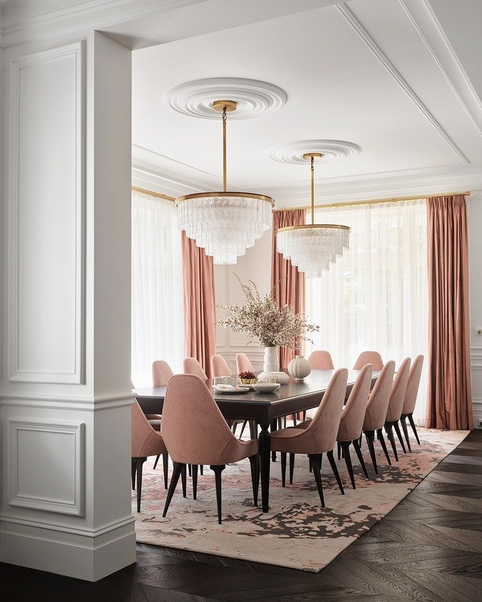 This pink dining room decor look is softer, but it still has drama. The walls are pink paneled, like a pretty old house but updated. The long dark table grounds the whole room, so the pink stays classy. And that floral rug is doing the “party” part without yelling. The chandelier looks like white petals floating, which is honestly so dreamy it hurts.