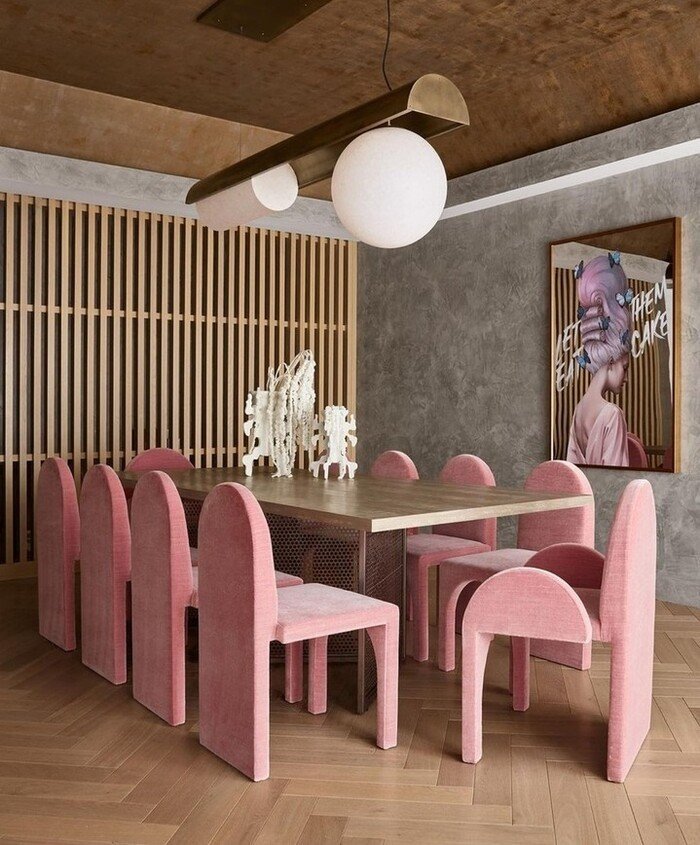 If you want this style, keep the table basic. Wood, stone, or a simple rectangle. Let the chairs be the moment. Add one texture wall like slats, plaster, or concrete-look paint. It makes the pink feel intentional, not random.