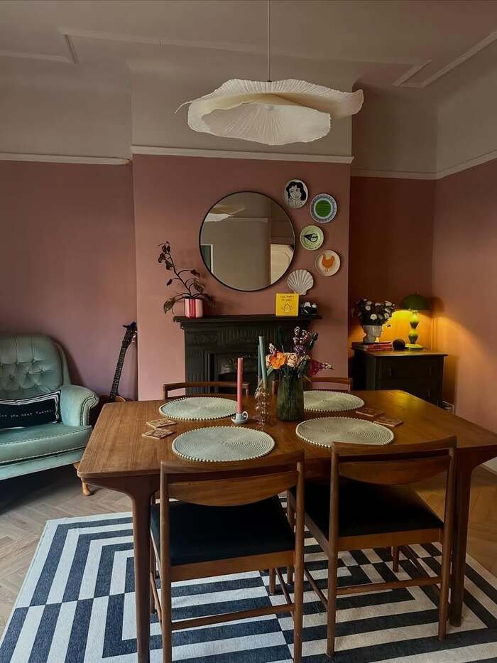 If you’re scared of pink, start here. A soft pink wall or even a pink-toned art print can give you that pink dining room look without committing too hard.