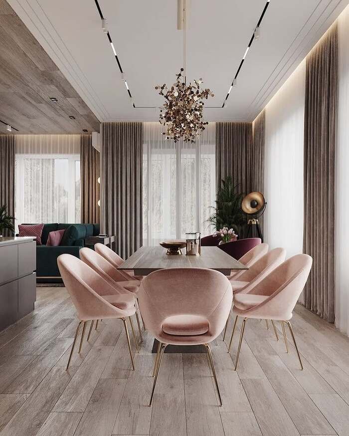 This one is such a fun mix. You’ve got soft pink seating, but then the bases are shiny and modern, like brass or gold. That combo makes pink dining room decor feel a little retro, a little glam, and not too serious.