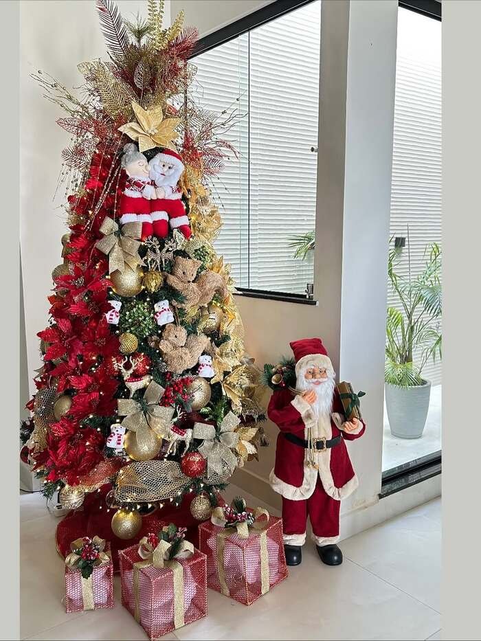 Use a slim tree, a woven basket base, and a spiral of red ornaments. Add a tiny garland on a shelf. You still get full red and gold christmas decor vibes.