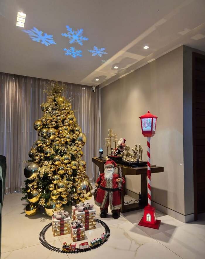 Then, add small pops of red so it still reads as holiday. A red velvet bow here, a ribbon tail there, maybe a few berry picks. You get luxury without losing the spirit. I would add two oversized snowflake projections on the ceiling like the photo because it spreads the sparkle around the room. It’s fully red and gold christmas decor but with a champagne twist, very grown-up, and still fun for the kids thanks to the toy train.