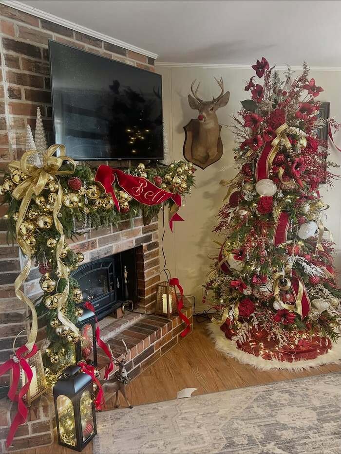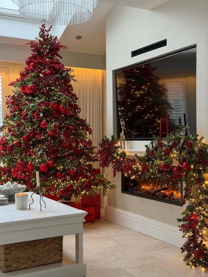 This one leans rich and moody in the best way. The tree is packed with peonies, berry picks, and matte red balls, then wrapped in warm white lights that read like liquid gold at night. The matching garland hugs the media fireplace, which is such a good move because it mirrors the tree and makes the whole corner glow. If you crave red and gold christmas decor that feels classic but current, this is your blueprint. Keep your reds mostly matte or velvet so the lights become the gold part. That glow is your metallic.