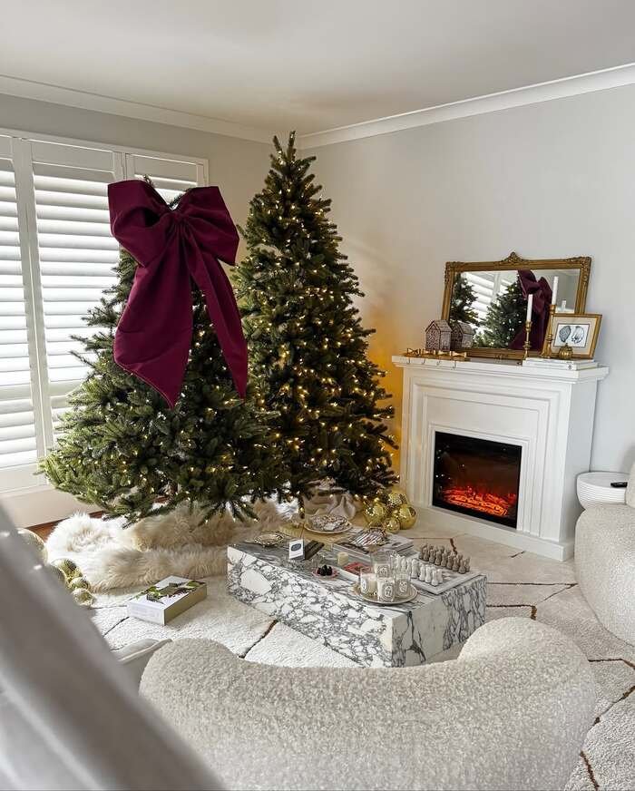 Okay, I didn’t think a single bow could carry a whole tree, but it totally can. The giant burgundy bow becomes the topper and the focal point, and the rest is simple warm lights on a natural looking tree. The room stays calm with creamy boucle chairs, a marble table, and a tiny electric fireplace. If you’re renting or just tired, this is your low-stress red and gold Christmas styling idea. The red is obvious in the bow. The gold is suggested by brass accents on the mantel mirror and those shiny ornaments gathered on the floor.