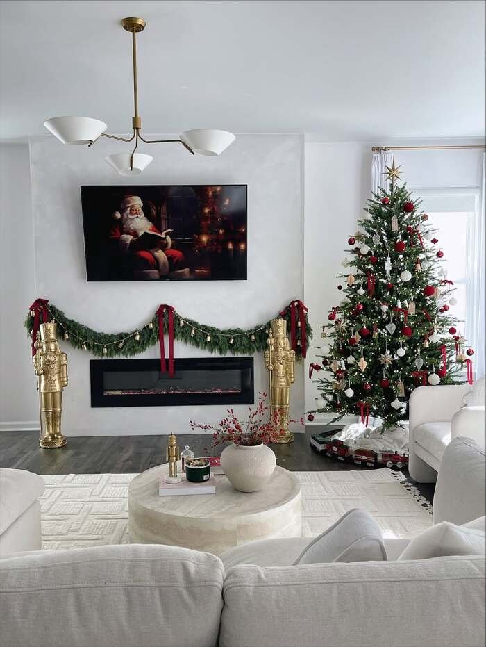 This living room is crisp. White walls, black linear fireplace, a TV mounted high, and clean furniture lines. The garland is simple cedar with strands of lights and red ribbon tails hanging every couple feet. What lifts it is the pair of tall gold nutcrackers framing the whole scene. They act like columns and bring the gold in a big graphic way. The tree on the side follows the same rules, red and white ornaments with tiny pops of metallic. There’s even a train around the base. It’s child friendly without losing the grown up vibe.