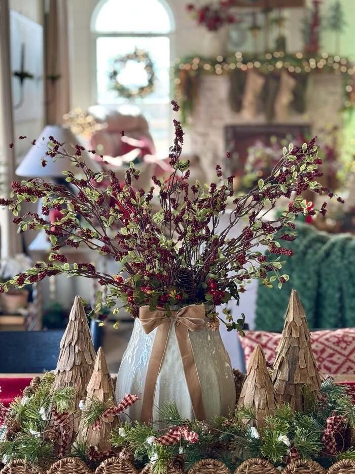 I love this centerpiece because it looks like a little forest party. A big white vase is filled with berry branches and soft green stems, tied with a tan ribbon. Around it sit mini trees carved to look like bark, plus a wreath base of pine, pinecones, and tiny gingham bows. There’s no heavy glitter. It’s cozy, earthy, and still festive. If you prefer a natural take on red and gold holiday decor, let your “gold” come from warm lighting and wood tones. A few brass candleholders near the arrangement will add the metallic touch without shouting.