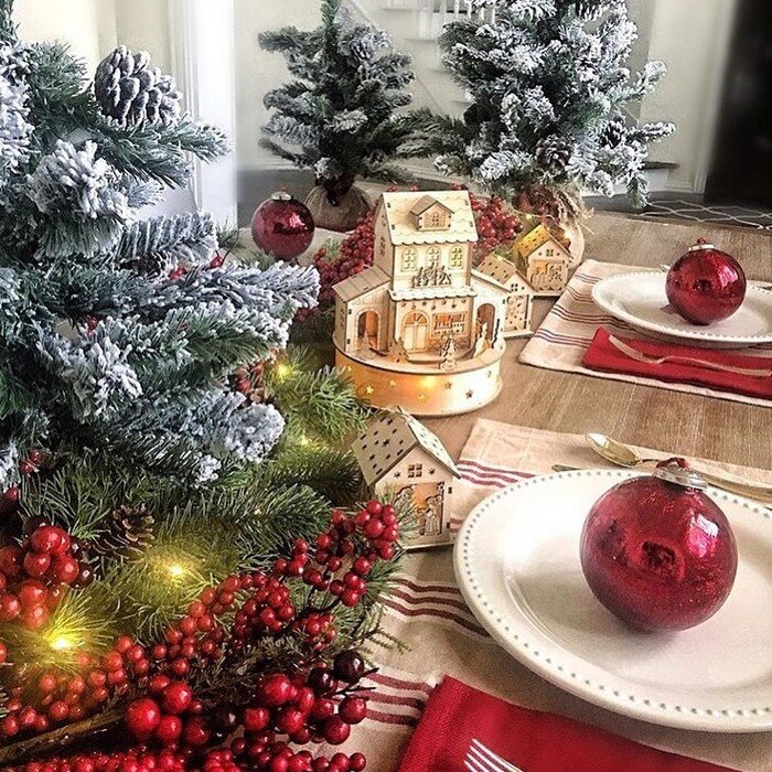 This table makes me smile because it’s playful. A frosted garland runs down the center with pinecones and berry clusters, dotted with battery lights. In between, a tiny wooden Christmas village sits like a storybook. At each place setting, a single glossy red ornament becomes the showpiece. So easy. The gold shows up as warm twinkle lights and the rim of the dishes, which is the sneaky way to do gold and red Christmas on a budget.