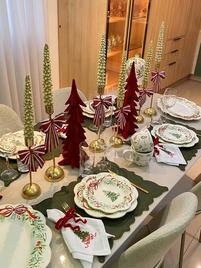 This table is a masterclass in repetition. The plates have green wreaths and red ribbons, and they sit on deep green scalloped placemats. Down the center run tall cone trees and red felt trees, with striped bows on the candlesticks. It’s basically a runway for hot cocoa and jokes. If you ever feel unsure setting a holiday table, copy this structure. Keep plates white with red and green accents, then add red and gold holiday decor as height in the center. Tall pieces make any table feel dramatic.