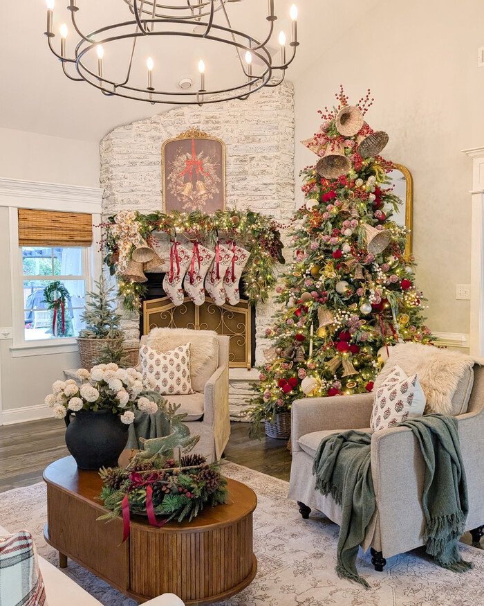 This room nails comfort. The tree is stuffed with big bell ornaments, berry picks, and gold leaves. The mantel holds stockings that match the color story, and there’s greenery everywhere. I love the way the garland dips once in the center. It frames the fireplace like a necklace. If your space has a strong focal point like a stone fireplace, let the tree echo it. Use soft textures on the seating, a knitted throw, and pillows with tiny red prints. The eye bounces between the fireplace and the tree, which is exactly what you want.