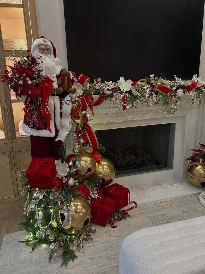 I can’t lie. The huge golden jingle bells got me. They’re dramatic and a tiny bit extra, which I love. The garland is packed with white flowers, pearls, berries, and bows. A life-size Santa stands watch with a mini gift stack. If you’ve got a TV over your mantel and you feel stuck, steal this idea. Build two clusters at the ends of the mantel and let them trail down. Keep the center low so the TV isn’t blocked. The clusters give a couture feel while still being practical.