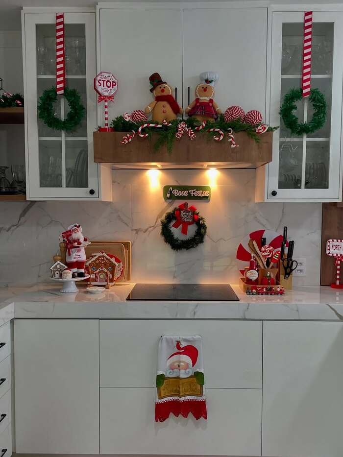 The kitchen setup made me grin. Tiny wreaths hang from red striped ribbons on the cabinet doors, and the stovetop hood gets a happy cluster with gingerbread figures and candy picks. On the counter sit a Santa, a small wreath sign, gingerbread houses, and a utensil holder with peppermint swirls. Kitchens are tricky because of grease and steam, so go light with anything fabric and keep most pieces wipeable. Ceramic houses and plastic candy canes are your friends.