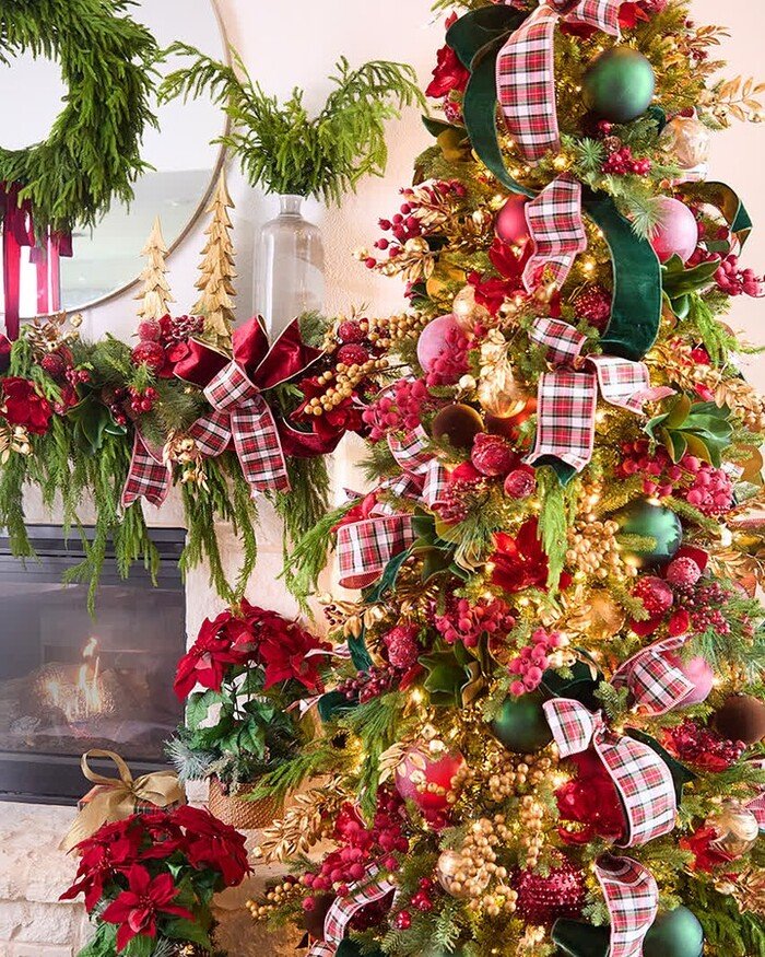 This close-up shot shows what ribbon can do. There are plaid bows, deep green velvet loops, red berry clusters, and shiny ornaments nestled in. When I tried this last year, I learned to pre-make several bows and wire them to pipe cleaners. Then I could twist them to branches fast and keep the bow shapes crisp. Mix pattern scale. One wide plaid, one narrow satin, one velvet. Add gold berry sprays to catch the lights and you’ll get that layered, lush look.