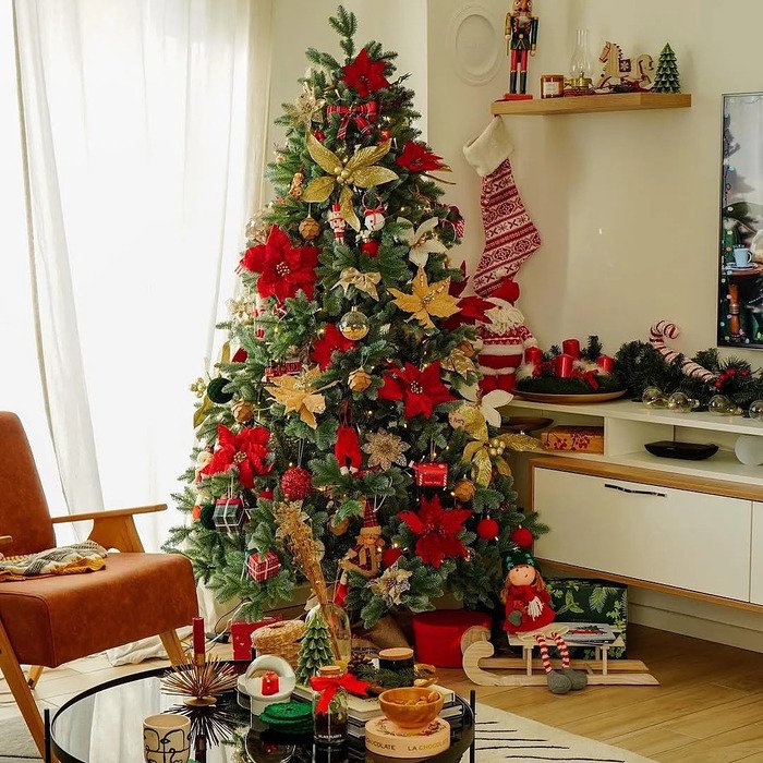 Another smart move is to tuck some ornaments deeper near the trunk. Those act like shadow makers. Then hang larger red balls toward the outer edges. The contrast gives structure. If you love gold and red Christmas styling, this is it. It feels a tiny bit formal without being stiff. Every square inch is interesting, which helps if your tree sits near a big window or mirror because the reflection doubles the pretty.