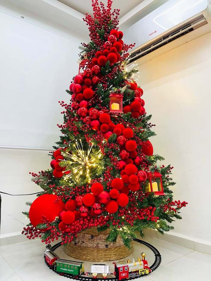 I’m obsessed with this design because it’s simple and still dramatic. The tree spirals with a wave of red balls and berry branches, all the same tone, while gold is delivered by the warm lights and a few spark bursts. There’s a little lantern tucked in and a tiny train circling the base. If your taste leans modern, copy this. Pick one red tone so everything matches. Build a swoop from the top down, keeping ornaments close together like a ribbon of color.