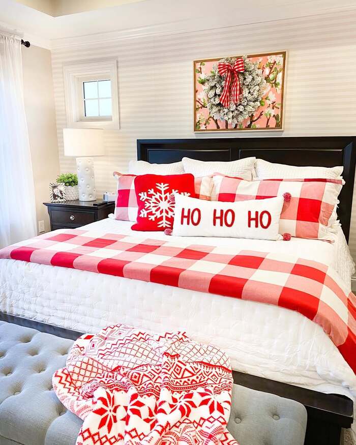 We end with pure fun. Gigantic buffalo check blanket over crisp white quilting, a snowflake cushion, and a long HO HO HO pillow that probably makes every kid smile. A wreath art piece with red stripe ribbon hangs over the bed which repeats the checks without more pattern. The ottoman wears a Nordic knit throw, and the whole room feels bright and happy.