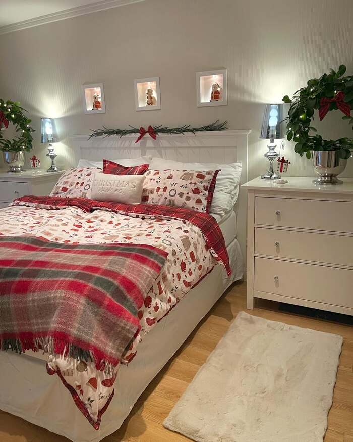 To steal this look, stay strict with the palette. Keep metallics to polished chrome and a little mercury glass. Place matching wreaths in silver trophy planters on both nightstands. If you can’t find trophy cups, thrift any chunky bowl and tuck in cut greens. The secret is symmetry. This red and white holiday bedroom feels calm because both sides of the bed mirror each other. I’d only edit one thing. Pull the plaid runner a bit closer to the foot so more of the cute print sheet shows. That tiny tweak reads styled, not rushed.