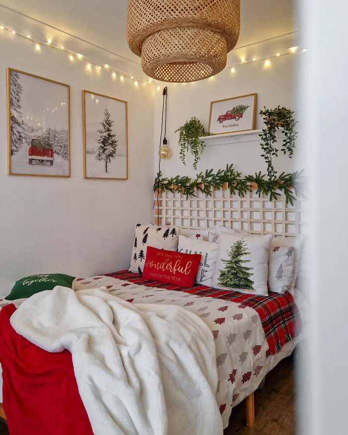 Fairy lights around the ceiling line are such a win. They frame the whole space like icing. A rattan pendant adds warm texture to balance all the red. The headboard grid is a clever DIY, and garland woven through it softens the geometry. Bedding is playful with tiny tree prints and a red tartan runner. Throw pillows repeat tree graphics and a bright typography cushion sits center like a cheerful host.
