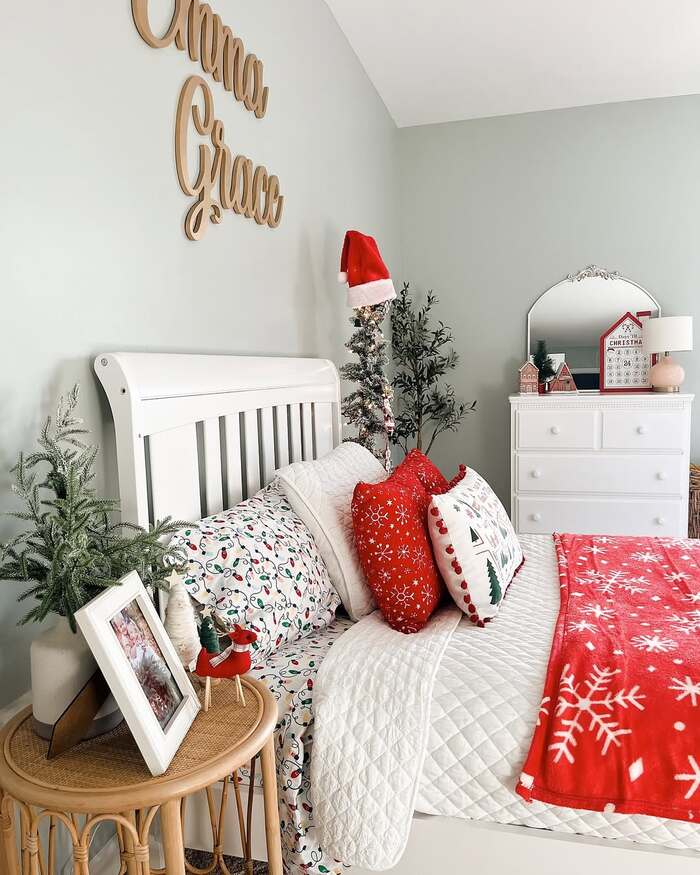 This space has storybook energy. A white sleigh bed keeps the silhouette soft while bright pillows do the talking. The cherry-red snowflake blanket gives instant December vibes. The sheets covered in mini light bulbs are goofy in the best way. A tiny tree in the corner wears a Santa hat like it’s ready for a class party. On the dresser, a little village and a countdown sign make the room feel interactive.