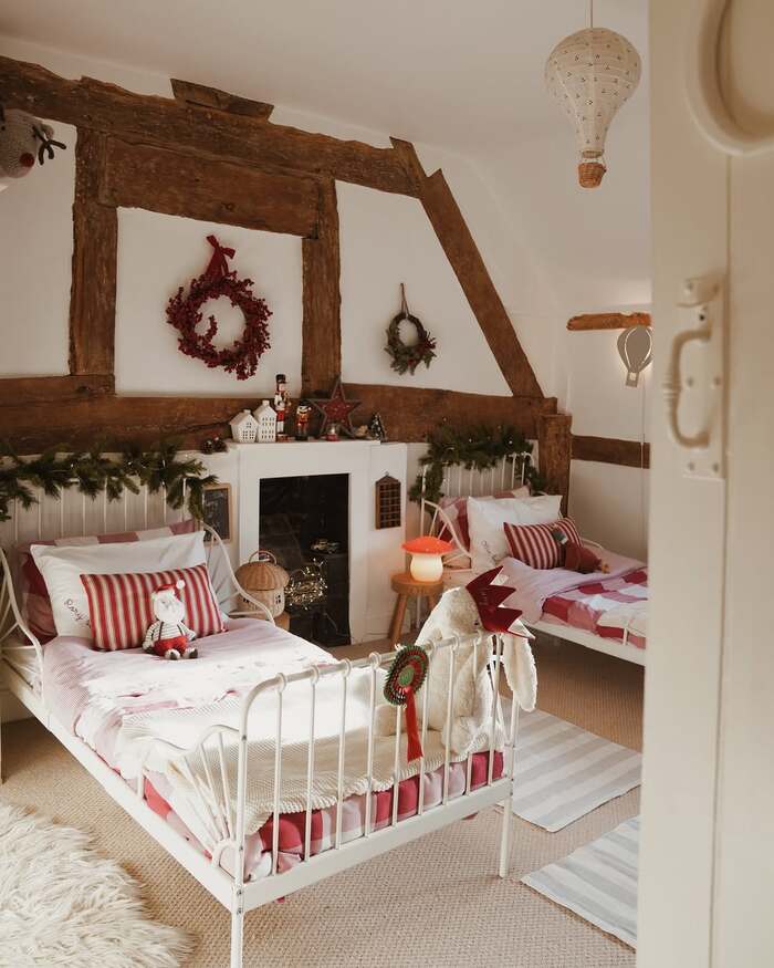 The architectural beams in this room are stealing the show, so the beds stay slim and simple. White metal frames feel vintage and a bit whimsical. Garlands trail over the small fireplace and wreaths hang at different heights, which keeps your eye moving. Bedding stacks red stripes, blush pink, and crisp white. A tiny doll and star decor nod to childhood without clutter. The warm glow from a mushroom lamp near the hearth is such a cozy touch.