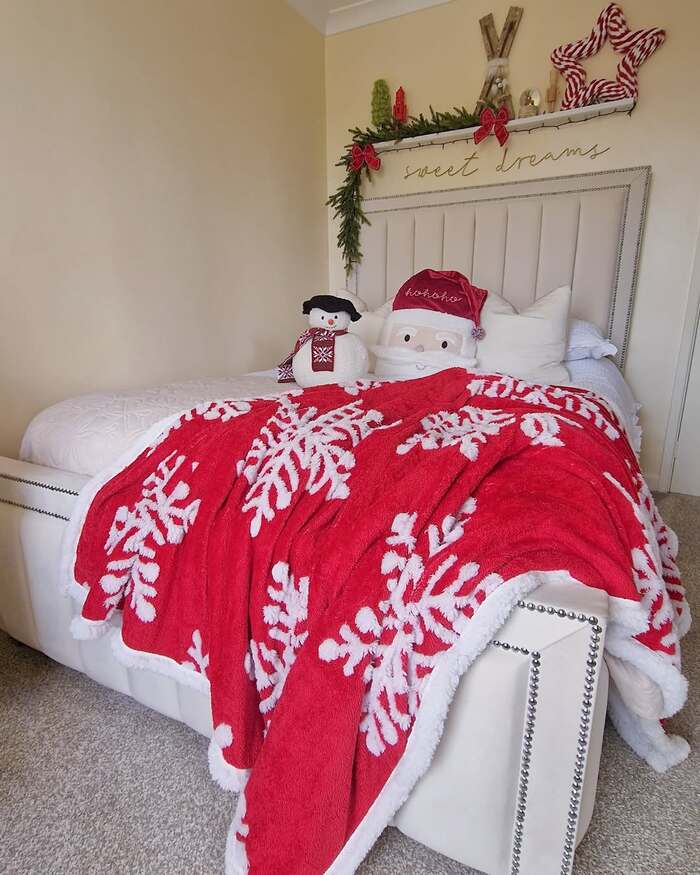 One bold blanket can carry a whole room. The oversize red sherpa throw with white snowflakes does exactly that. It looks like hot cocoa in textile form. The upholstered bed with nailhead trim keeps everything polished. A slim wall shelf above the headboard holds a small garland, peppermint stripes, and a star shape. The words sweet dreams in light script float just above, which feels bedtime-friendly.