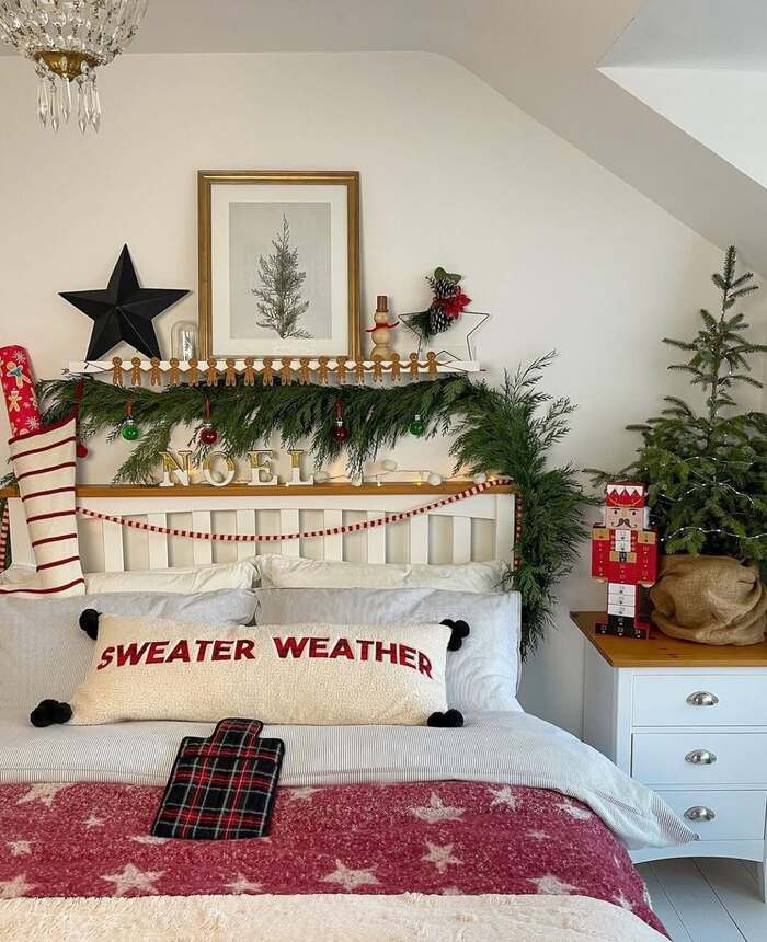 Here the headboard acts like a mini mantel. Fresh greenery tucks under a spindle rail, wood beads swag across, and small ornaments nestle in. The framed tree sketch and a big black star bring contrast. I’m obsessed with the Noel letters tucked into the greenery like a secret. Bedding keeps to soft whites with a raspberry star throw at the foot and a giant Sweater Weather lumbar that basically announces cuddle season.