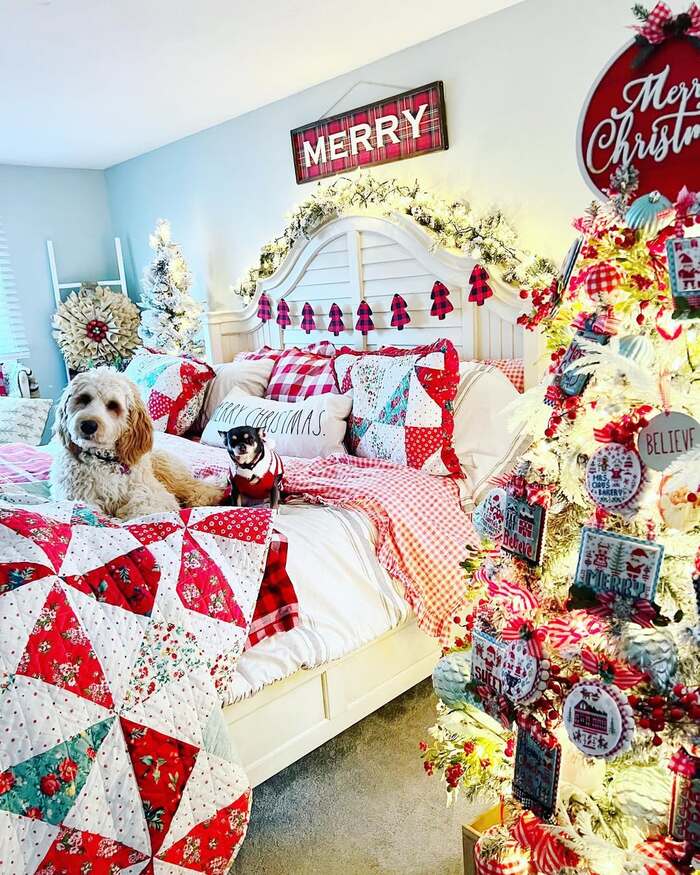 This last space is happy chaos in the best way. A patchwork quilt mixes prints like gingham, floral, and dots, all in the red and aqua family. The headboard gets a glowing garland, a row of tiny tassels, and a plaid MERRY sign right above. A bright white tree to the side is stuffed with peppermint ornaments and ribbon curls. Two very good dogs on the bed double as living accessories and also steal the show.
