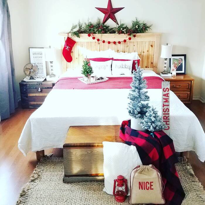 Here’s the friendly, handmade vibe. A raw pine headboard wears garland and a red felt ball swag, with a big barn star to nail the theme. The bed is mostly white, then a berry red waffle blanket anchors the middle. At the foot you get mini flocked trees, buffalo check throw, and a jute rug to ground it all. It feels like a bed-and-breakfast after a snowstorm, in the best way.
