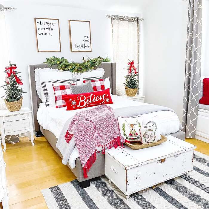 I adore this cheerful setup. Gray upholstered headboard, snowy sheets, and stacked pillows in stripes plus buffalo check. The “Believe” pillow is cheesy and I still love it because it’s bold and centered. Small trees in basket planters flank the bed with ribbon bows, which is such an easy way to pull the red back around the room. White chest at the foot doubles as decor storage.