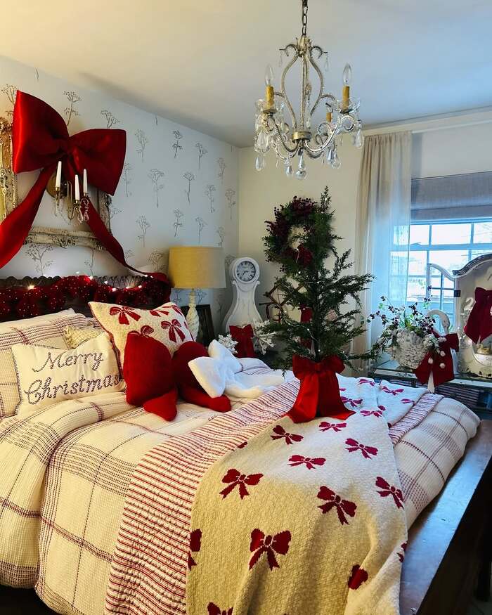 For a polished red-and-white holiday bedroom, keep the textures soft. Knit, linen, and velvet. Avoid high-gloss red because it can feel toy-like. Balance the bow moment with neutrals around it. I’d place a white clock or a pale lamp on one side to calm things down. My confession, I tried two giant bows once and my husband asked if the bed was getting married. One bow is romantic. Two is a wedding.